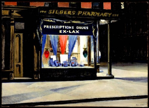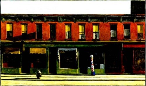 What is so compelling and iconic about the empty main street of "Early Sunday Morning" from the Whitney Museum? I recall driving through small New England towns that looked just like that during my youth in the early 1950s. That emptiness and absence of cars, parking meters, or foot traffic or the colorful, striped, barber pole advertising where a haircut cost fifty cents. Perhaps Hopper knew the unpopulated, Sunday morning, urban views photographed by the Parisian Atget. It is just such empty urban views conveyed by the super realist paintings of Richard Estes.