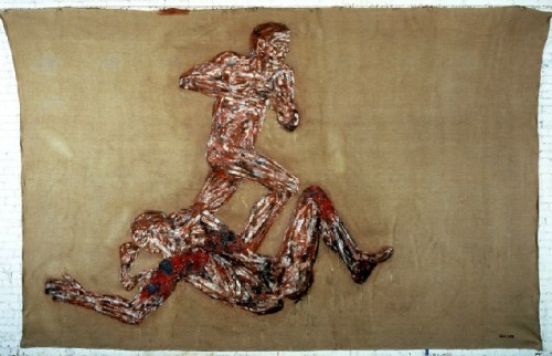 With those historic markers the curator has filled out the galleries. There are two riveting works by one of the greatest figurative/ protest painters of the Vietnam era, Leon Golub. He is represented here by the raw, burning flesh "Napalm" vividly depicted in an expressionist manner on unstretched, unprimed, linen, and the horrors of "Interrogation 1." Golub's 1980-81 painting is a grim precursor of what happened more recently at Abu Ghraib.