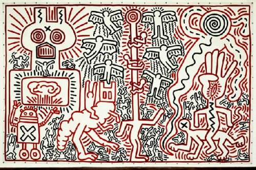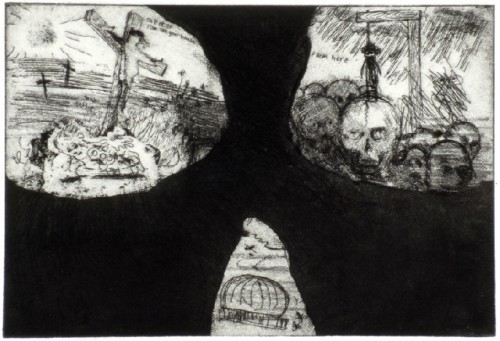 There are works in the show that make more sense for their iconic, celebrity status than providing a contribution to the theme and understanding of the exhibition. Given the choice curators often find a way to include Andy Warhol, relevant or not, here represented by a camouflaged Statue of Liberty as a metaphor of American at war, well, ok, but the grommeted work by the late graffiti artist, Keith Haring, is more of a stretch, or unstretched in this case. The more so because it is displayed outside the gallery in the corridor that leads to the exhibition. The casual observer might conclude that it is a catchy banner meant to accent the gift shop and upscale café. The big, ponderous, Robert Morris work in which the frame is a dark relief of tangled corpses, the body county of war, is well, big, ponderous, and a Robert Morris. There are those who continue to think of him as an important artist but that is more was than is. This piece doesn't really do much for the show. Ditto for a vague double depiction of bombers in a painting "Approach" (1989) by the enervating Richard Bosman.