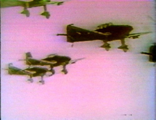 Where curators make their bones is in offering us something fresh and provocative. Here Brutvan pulls it off by offering strong video selections. The video loops by Boston based artist Suara Welitoff presented a pop, Candy colored montage of the fighter planes of the Great Generation. She reached back for vintage war imagery but gives it a zingy update that is both sicky sweet looking in its pink, catchy, feminine colors and also head thumping when we realize that the mission of these planes is to decimate Axis cities including the fire bombing of Dresden.