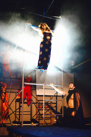 What is fascinating about the director’s choices in LoftOpera's production is that they do not at all interfere with Pergolesi’s beautiful music. Instead the singers and dancers move with the music on runways built like a fashion show. There are four ramps and they sprawl out from the central scaffolding which suggests the cross. The audience is wedged between the runways, often looking up at the singers and dancers, who loom over us, very close and very tall. We always see the cross and feel its pain.