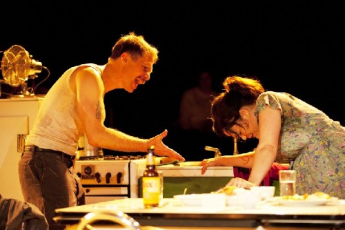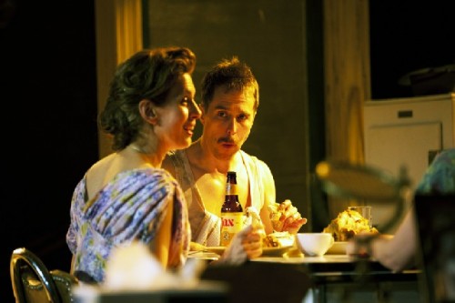 This production directed by David Cromer established a new sense of transparency. Literally. We actually saw through the set, a clunker designed by Collette Pollard, to several rows of seats. It was like living in an apartment complex and seeing through your neighbor’s windows. We were seated in the last row, center. In the intimate Nikos there are no bad seats. During intermission I asked a colleague who was seated on stage for his thoughts. He loved the up close and personal impact particularly during the steamy mating scene between Stanley (Sam Rockwell) and Stella (Ana Reeder). He revealed intimate details which I would blush to share with you. From our distance, in the dim, moody lighting by Heather Gilbert, the sex scene was less arousing.