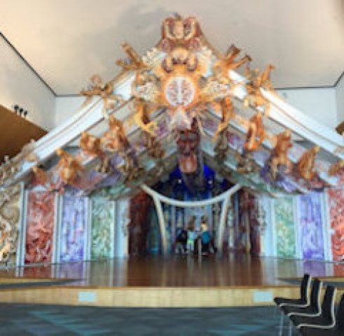 Another city highlight is the Te Papa National Museum of New Zealand, which stands at the edge of Wellington harbor. Meaning “Our Place” in Maori, Te Papa is a six-story museum in two attractive connected buildings, with collections ranging from natural history to Maori and Pacific Islander artifacts, and even includes an impressive exhibit on the Battle of Gallipoli. The entrance level welcomes visitors to a functioning marae (communal center) reflecting contemporary Maori art and design. The museum’s most treasured area is a traditional whare (gathering place for ancestors) dating from 1840. The style of the house, constructed by master carvers, is defined by the interplay of light and shadow, reflecting the dramatic effect of changing light upon the landscape. No photography is allowed in the area.