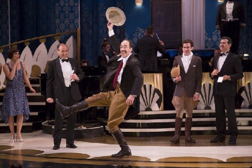It was just the kind of improv that the Marx Brothers loved with no great allegiance to the script. There were numerous witty asides in a madcap version of a classic Mark Brothers play and film adapted and directed with great energy, wit and creativity by Henry Wishcamper. He is reviving a 2009 production of the musical comedy for Chicago’s Goodman Theatre. From that production he again cast the brilliant team of Joey Slotnick and Jonathan Brody in the essential roles of Groucho, as Captain Jeffrey T. Spaulding, and Chico as the ersatz Italian immigrant and bounder Emmanuel Ravelli. Rounding the trio as Harpo/ The Professor was the fabulous physical comedy of Brad Aldous.
