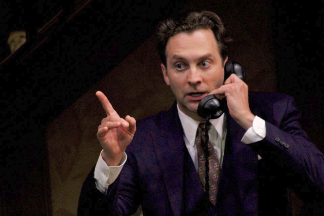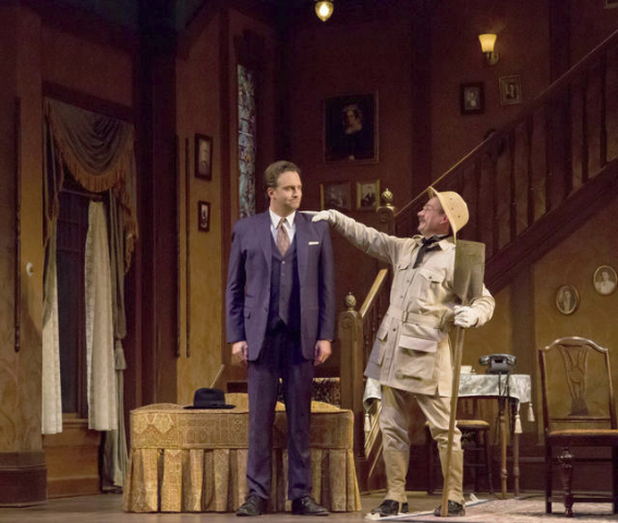 In a hilarious turn of events, Mortimer discovers the body of a gentleman in the windowseat. Rowat shines in displaying his comedic chops here (he starred in the drama Constellations at BTG last year with his wife Kate Baldwin displaying his versatility).
