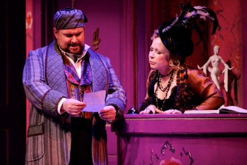 If you would enjoy an evening of pure farce, as we suggested by quoting "De Gustibus" well, nobody does it better than WTF. Like everything we have seen this season under artistic director Nicholas Martin there is no scrimping on production values. The sets of Alexander Dodge are amazing. The first and third acts are set in the drawing room of the business man Victor Chandebise, the walls are choc a bloc with bric a brac. There all kinds of ceramic plates and urns attached to the walls, which are painted in a dazzling pattern of blue and white evoking Wedgewood and ersatz Adam style. There are decorative plinths and niches. From this bourgeois domain we are off to the Frisky Puss with its riot of violet, pink and accents of cheap, gilded molding. The costumes of Gregory Gale are stunning. Both the men and women are gorgeously attired in period dress.