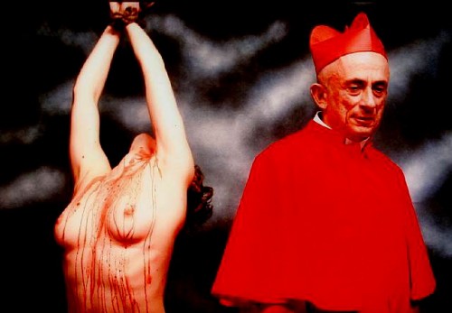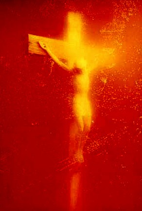 The work of Serrano first came to my attention in a group exhibition "Fact, Fiction, Fragment, Fetish" at the Stux Gallery in Boston in 1986. The images, which seemed bold and tough at the time, included a Coyote being lynched, a pile of beef hearts forming a hill topped by a crucifix. One image "Heaven and Hell" depicted two figures. On the left was a bound, nude woman with blood splashed over her body, and, on the right, a Cardinal in scarlet robes. The Cardinal was the artist Leon Golub who posed for the image. At the time, it seemed this was an artist to keep an eye on.