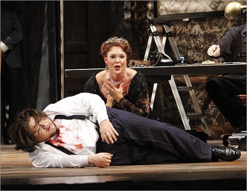 The test of a good “Tosca” is whether it thrills or not, and this one does. (Of course even a lousy production of the opera can’t help but thrill. Puccini has written a fail-safe work: The thrills are built-in.) In addition to the production strengths, the principal cast members fully inhabit their characters. The playful scene between Tosca (Jill Gardner) and Mario (Diego Torres) in Act I suggests a previous physical familiarity, and her jealousy is more than credibly projected, even as you know that she will forgive Mario almost anything. And Scarpia (a Scott Brown good-looking Bradley Garvin) is menacing from his first entrance, his storm-trooper outfit the ornament of his sexy persona. (Read Susan Sontag’s “Fascinating Fascism” if you don’t understand the allure.) The scene between Tosca and Scarpia as he maps out her seduction while her lover is being tortured off-stage is physically exacting and emotionally gripping: the prelude to a negotiated rape, but, boy, does she have a surprise for him. Her stabbing is brutal and drawn out. First she drops the hidden knife, then, recovering, grabs a pair of scissors off his desk and stabs him again and again and again, crying “muori” – die!