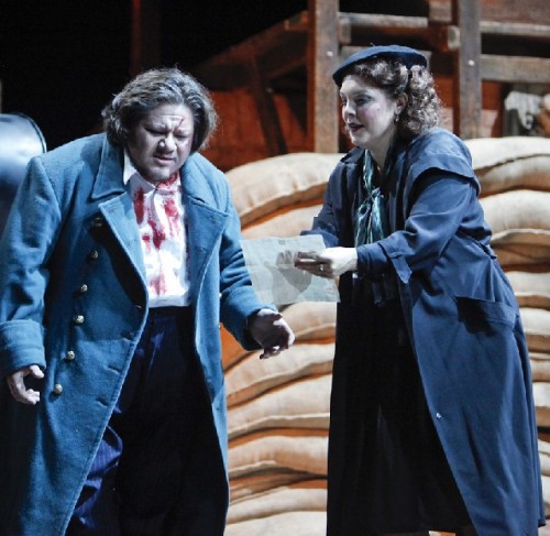 Unfortunately, the singing did not come close to equaling the acting. All principals are solid, but none offer the thrills of great Italian singing. Torre lacks the Italian “ping” that made singers like Luciano Pavarotti (and today’s Juan Diego Florez) rich and famous. His cry of “Vittoria” when the news of a Napoleonic victory interrupts his torture did not ring. The memory of Franco Corelli on tour here a quarter of a century ago with the Met at Hynes Auditorium still resounds in my ears. (Not to mention Pavorotti singing under the same auspices with Magda Olivero, but you can’t compare anything to that night – it was a once-in-a-lifetime experience.) And his delivery of “E lucevan le stelle,” (“And the stars shone”) in which he reflects, before his execution, on his love of his soon-to-be-extinguished life, lacked the melting lyricism that makes it a highlight of the tenor repertoire.