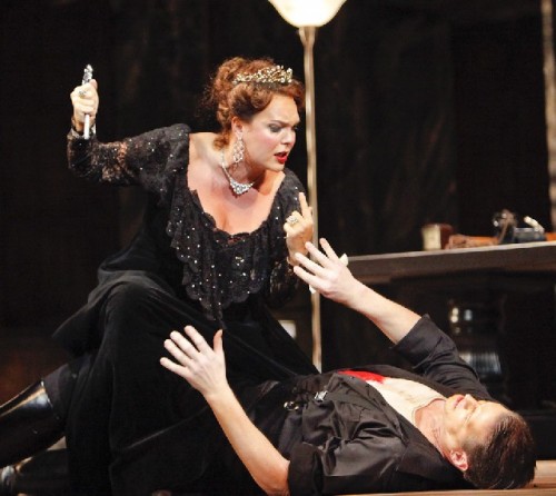 In general, the production concept (by Anthony Besch), the sets and costumes (by Peter Rice) and the local stage direction (by David Lefkowich) and lighting design (Paul Heckenmueller) deserve high marks. Although there are a few caveats, the primary one being a red-gowned Tosca unnecessarily appearing at the end of Act I to hover over Scarpia.