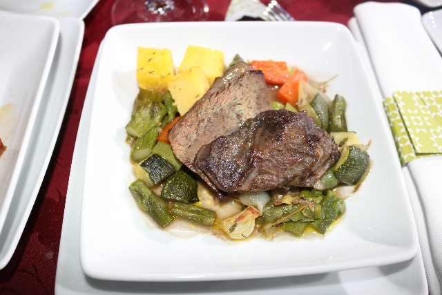 The meat dishes presented chef Maiguel Laffan’s Alentejo style pork, green asparagus Miga, and orange salad. This was the dish I ordered during the return flight in business class. The other meat dish was Stewed veal with sautéed vegetables and fried maize by chef Jose Avillez.