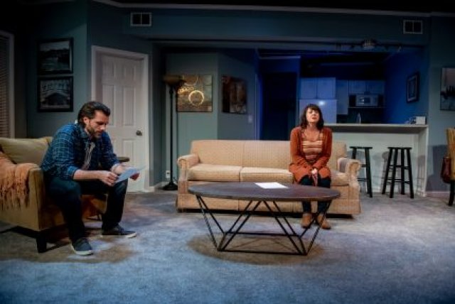 Meanwhile, Theatre Lab Producing Artistic Director, Matt Stabile, plays Wyatt with restraint. Whereas Fridh’s Merryn is high strung, Stabile imbues his character with an understated charm and easygoing manner that makes him endearing. However, the man is only human, and Stabile invests him with annoyance and exasperation when his estranged wife frustrates him. Even so, Stabile makes it clear that underneath the frustration and annoyance is a sincere desire to re-connect with his wife, and a sincere love of their late son. However, during the beginning, it is a bit hard to hear Stabile.