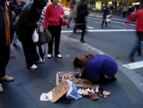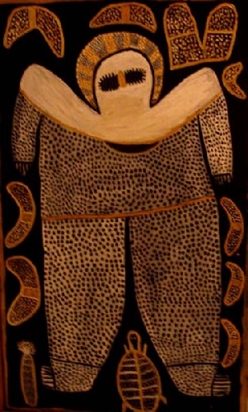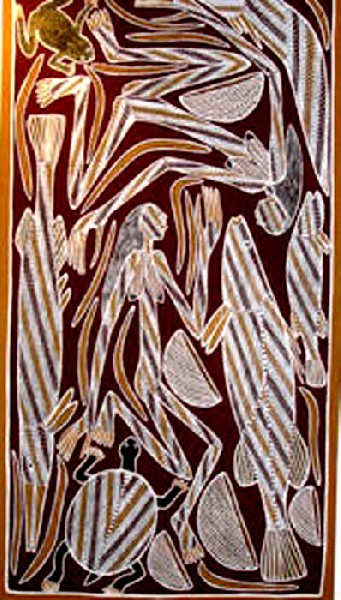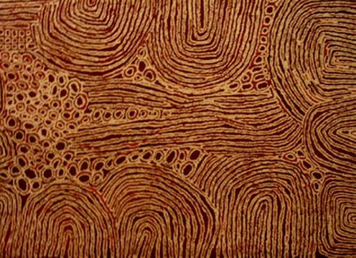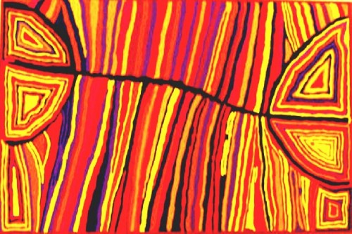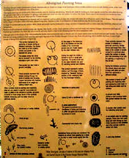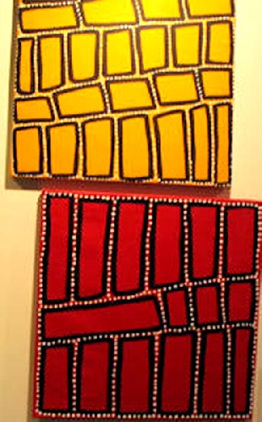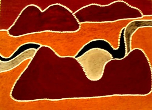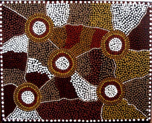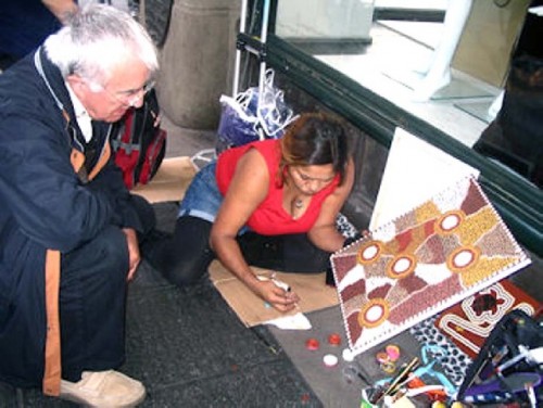 In downtown Sydney, on Pitt Street or George Street, in the direction of King Street, one can find several art galleries. We were just emerging from a gallery, when we came upon an intriguing scene. An Aboriginal artist and her companion were making street paintings, of approximately 15” x 20”or 40 x 60 cm scale. We carefully looked at her paintings, one especially interested me and I purchased it. Cherie, the artist, suggested that it was not entirely finished. She wanted to emphasize the white dots, painted them again and then handed me the painting.