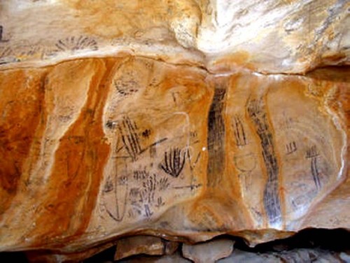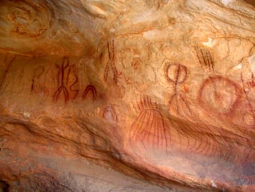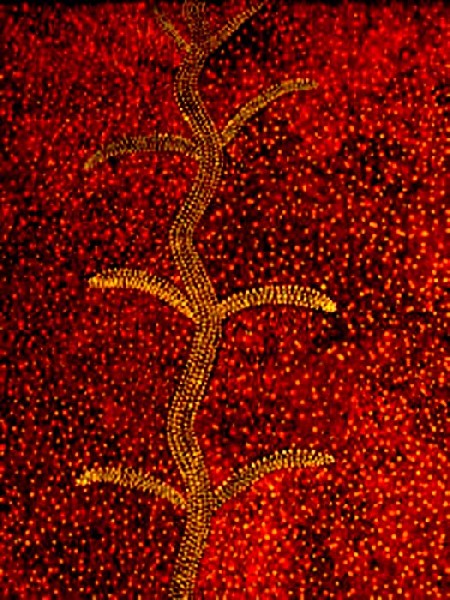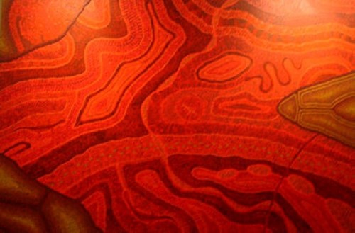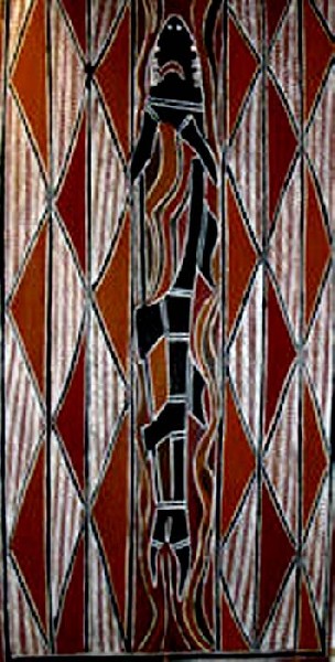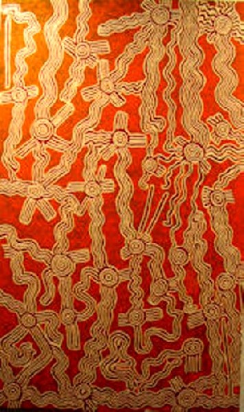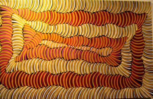 During a prior trip to Australia in 2004 Maryse had seen and photographed ancient Cave Drawings at the Mungo National Park. She was very intrigued by Aboriginal art, but at that time, few paintings by Aboriginal artists could be seen in galleries. Today, more works are being presented, mostly in Brisbane and Sydney. The paintings show traditional and symbolic images: Snakes that lived during the Golden Time, called the Time of Dreams, in Aboriginal Mythology. The snake refers to their ancestors and their first God and has different names in various regions. In New South Wales she is called Kurreah. Other images may represent men hunting, women carrying water jugs, boomerangs and lizards, which are of nutritional value.