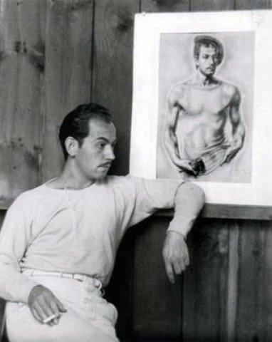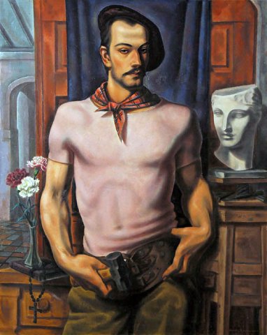 With a bandana and beret he strikes a macho pose for “Psyche and the Sculptor” from the 1930s. He holds a hammer in the vicinity of his groin. To the right is a marble bust of the god which he has carved.