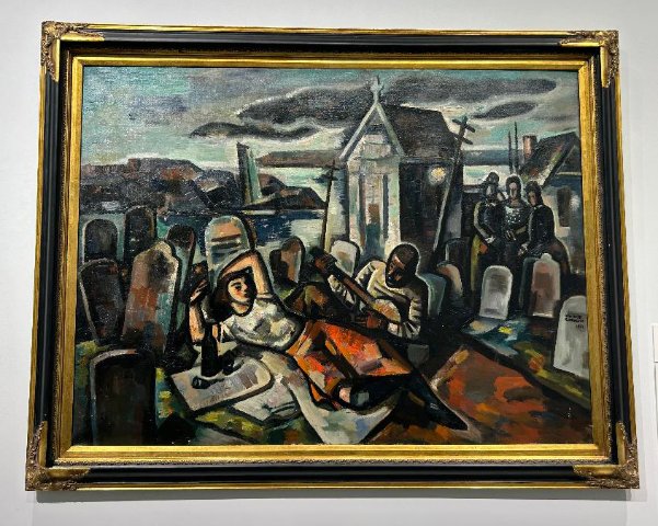 Even in the 1930s, however, there was an edge to the work in, for example, “New England Tragedy,” 1934. The dark, expressionist painting of a picnic has a woman stretched out in a lascivious manner with her arms clasped behind her head as though welcoming a lover. He is seated on the ground next to her strumming a guitar. This evocation of Le Déjeuner sur l’herbe is incongruously set among grave stones. There are women to the side who witness this lewdness. It’s an odd but engaging painting.