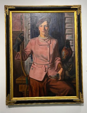 In the art deco inflected manner of the period his first wife is shown with dress of the era as the mythical “Diana” goddess of the hunt. With an archer’s glove she holds an unstrung bow in one hand and a quiver of arrows in the other. Her posture and gaze are frontal and somewhat menacing. This is a woman who means business. A triple strand of pearls is out of sync for a woman of action. Romano’s goddess is less a nymph of the forest than a sophisticated lady of status and means.