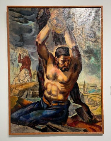 The works from the 1940s were erratic. From 1946 “Let My People Go” was a misstep into the domain of social justice. He was out of depth and melodramatic in treating the subject of slavery. This is an aspect of the work that needs further research. “Ecce Homo” (1949) is somewhat more successful. A well conditioned man, stripped to the waist in jeans has his hands bound above him. It illustrates the words of Pontius Pilot “Behold the Man” who washed his hands of the condemned Christ.