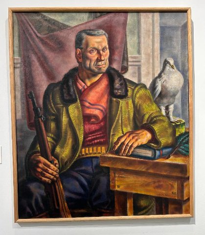 Another strong work of this period is the portrait “Gamekeeper.” The man with chiseled handsome features is seated with his head gazing to the side. He is dressed for outdoor work with a gun in one hand and his other arm resting on a stack of books on a table. There is a stuffed bird as signifier of his trade. The artist conveys this man with palpable respect.