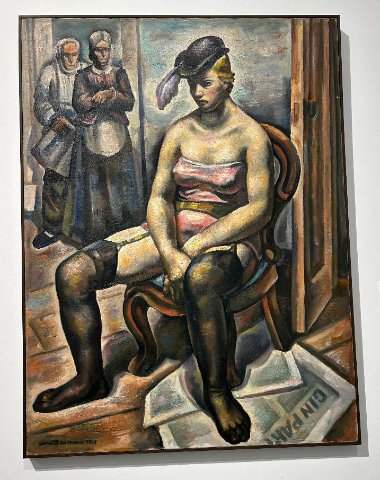 The most curious painting in the exhibition is “American Breadwinner” undated but likely from the 1930s. A woman in her underwear with garters and stockings is slumped into a chair. Her arms are folded concealing but drawing attention to her genitals. She wears what the catalog notes as an Empress Eugenie hat, a form of derby with a feather draping forward. What may be her parents are off to the side. Plausibly they may be the beneficiaries of her sex work during the Great Depression.