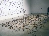 In the large vaulted gallery space we view a squared off area of twisted metal bars on the floor. On a wall, centered above this area, is a graphic image seemingly offering a two-dimensional, bird’s eye view of the twisted forms set upon a white field.