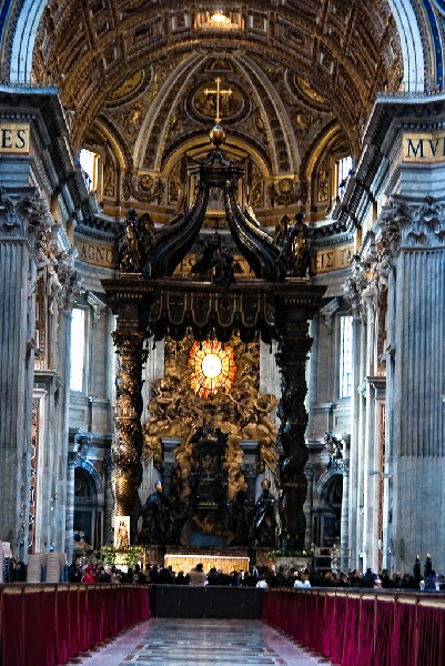 Many artists, sculptors and architects contributed to the greatest project in Rome, Saint Peter’s Basilica in the Vatican. It was Bernini who finished the Cathedral providing the horsehoe shaped colonnade, topped by sculptures that leads to the entrance. He also provided the four, monumental sculptures that mark the crossing, as well as the enormous decorative canopy The Baldacchino over the main altar. At the end of the apse he created the light infused Cathedra Petri (the throne of Saint Peter). As well as several enormous and comples tombs for Popes and the Vision of St. Constantine.