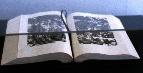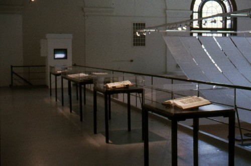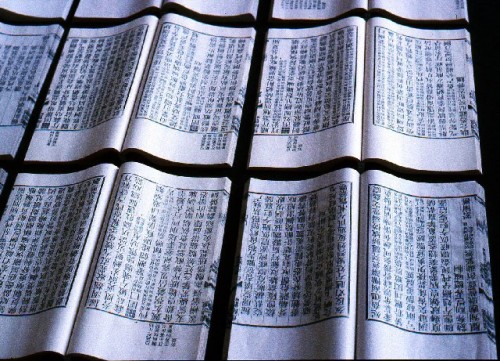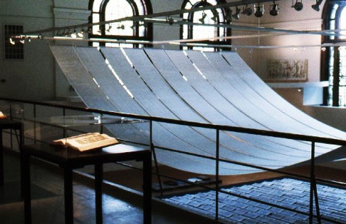 Underneath the suspended banners was a grid of 200 books opened in such a manner that they provided a rippling sea of text. Like most American visitors I assumed that they provided a narrative that I could not read.
