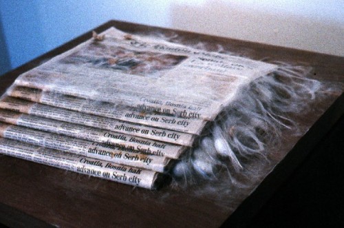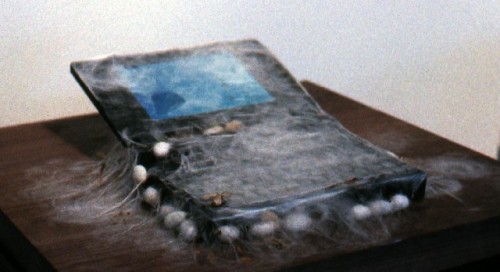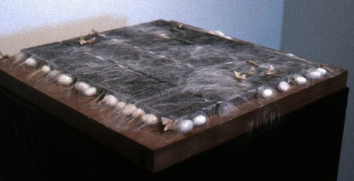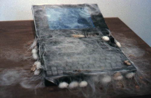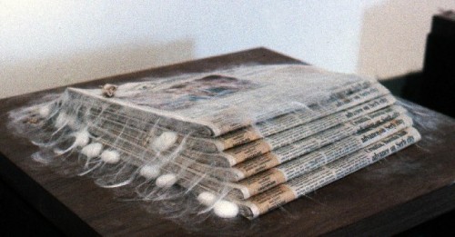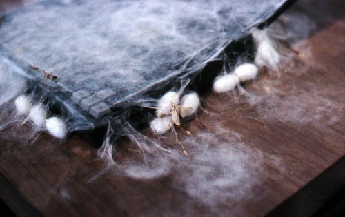 There is a balcony in the gallery that looks down into the exhibition space. Bing presented a series of displays and pedestals. On top of which was placed a stack of Boston Globes, a French dictionary and a computer laptop. These were covered with webs woven by live silk worms.