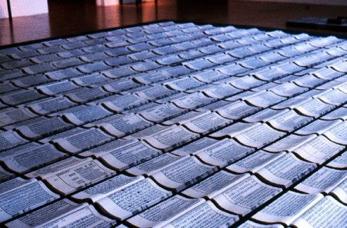 The irony, however, is that they would be just as inscrutable to a Chinese viewer. The books and banners were hand printed with some 4,000 carved invented characters. They were derived from a series by Bing called A Book from the Sky. The artist started the project in China and was then resident in the United States where he was awarded with a MacArthur Fellowship.