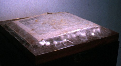 Walking around to the back of the light box one is surprised to see that the image has been created by casting a shadow over an array of found objects. These ephemera have been employed to create the illusion of a reproduction of an ancient Kakemono.