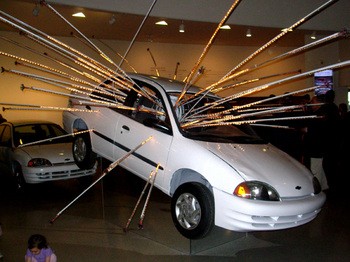 As with an earlier, large scale installation at the Massachusetts Museum of Contemporary Art, including several flipping cars in the museum’s largest space, we reflect on the difference between art and spectacle. Just how is one distinct from the other and what happens when the boundaries are blurred?