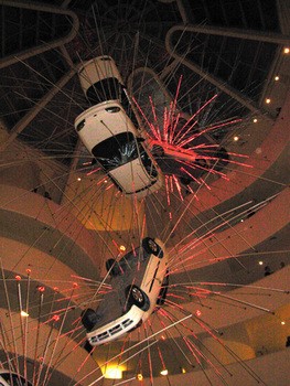 What to make of the seven white cars flipping and careening down from the top of the rotunda of the museum? From these sedans are spikes of flashing lights suggesting a multiple vehicle crash and explosions.