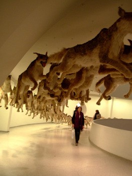Winding around the rotunda in one segment of the ramp is a double line of 99, life like, rampaging wolves. Their muzzles gasp for breath with snarling teeth and wagging tongues pant for air in extreme exertion. At the end of this headlong charge of angry wolves they come crashing into a plexiglass wall. While fascinating what does it mean? Surely there is a metaphor but it was not readily apparent. This is a similar response to the group of stuffed tigers hurling about pierced with numerous arrows.