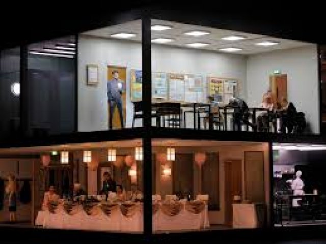 The set created by Chloe Lamford for the original production is a distinctive, rotating two-story structure that moves you through space (the school and a banquet room) and time (the present and ten years earlier). The wedding banquet often appears as The Last Supper in its long horizontality.