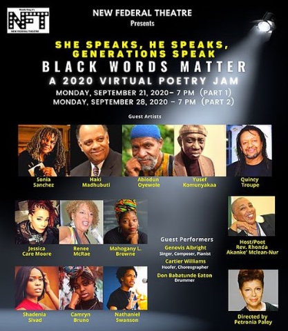A Poetry Jam! Featuring Sonia Sanchez, Yusef Komunyakaa, Mahogany L. Browne, Abiodun Oyewole, Jessica Care Moore, Quincy Troupe, Shadenia Sivad, Haki Madhubuti, Renee McRae, Camryn Bruno, Nathaniel Swanson and special performances by Genovis Albright, Cartier Williams & Don Babatunde Eaton! Conceived & Hosted by Rev. Rhonda Akanke' McLean-Nur Directed by Petronia Paley