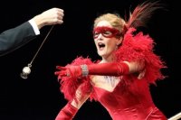 By: - Jan 15th, 2016How do smaller houses solve budget issues? Imaginatively in Pforzheim. The curtain which at first appears to be a rich taffeta, drawn back with ropes, decorated with ribbons and bows is painted on a moveable backdrop. Regal is presented with non-imperial efficiency. The costumes, when they are worn, are delightful. Arnalta looks a bit like a nun in stark black in white, in contrast to the brilliant orange feathers of Ottavia. When she ascends with her mistress at the opera’s end, she strips and dresses as the lady-in-waiting of the Empress. This strip is a fun and amusing touch.